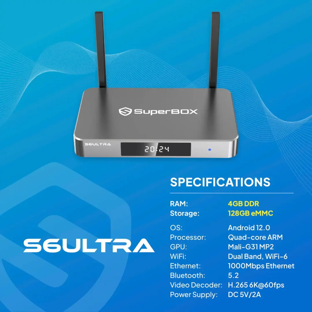 SuperBox S6 (2025 Version) offers next-level 4K streaming with upgraded performance, WiFi 6 support, Gigabit Ethernet, advanced Voice Control, and the powerful Time-Shift feature. Available in Pro, Max, and Ultra models, the 2025 S6 series delivers faster speeds, smoother playback, and a smarter home entertainment experience.
