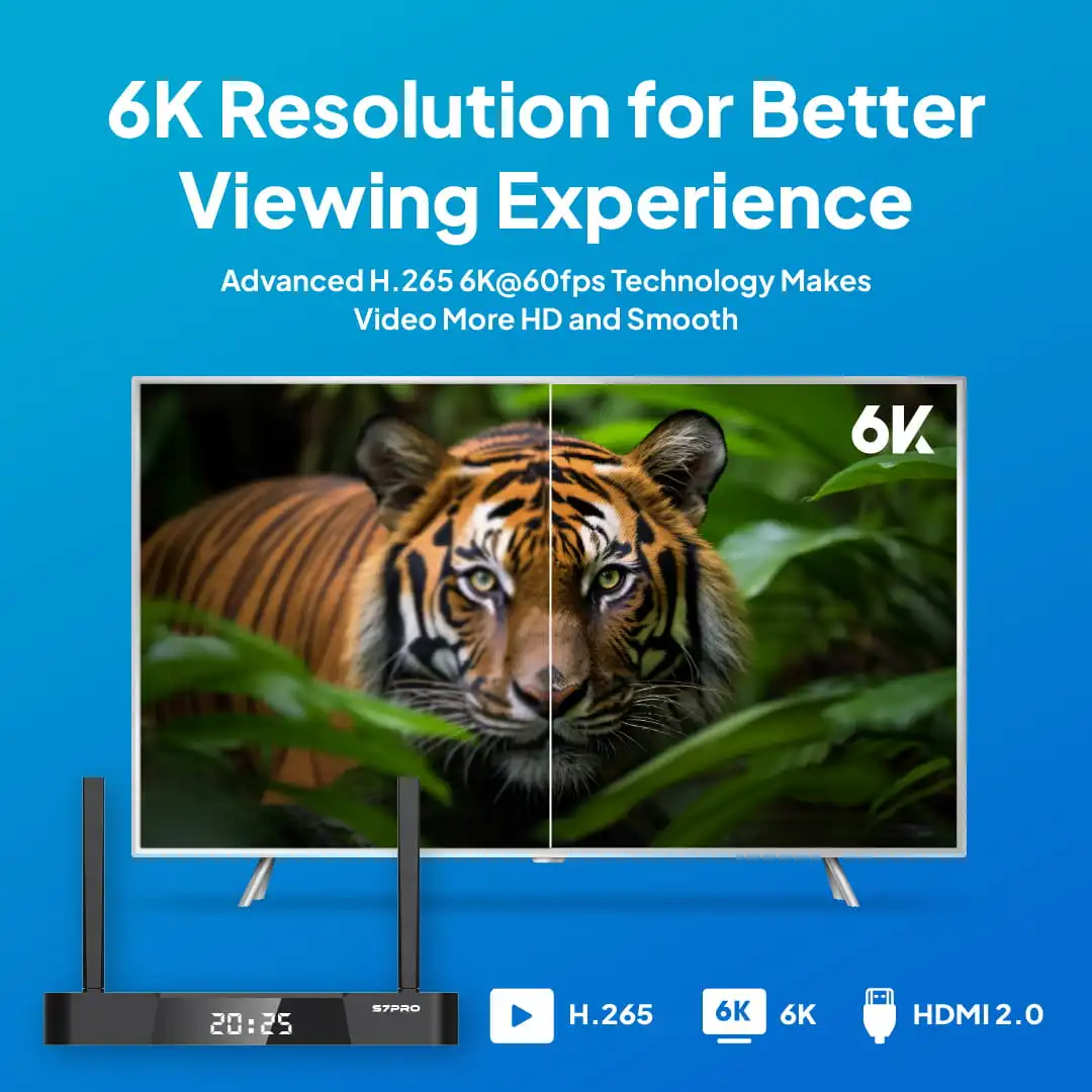The SuperBox S7 Pro supports up to 6K resolution for sharper details, richer colors, and smoother motion. With SDR, HDR, and AUTO display modes, it automatically adjusts to your TV and content for the best possible picture every time.