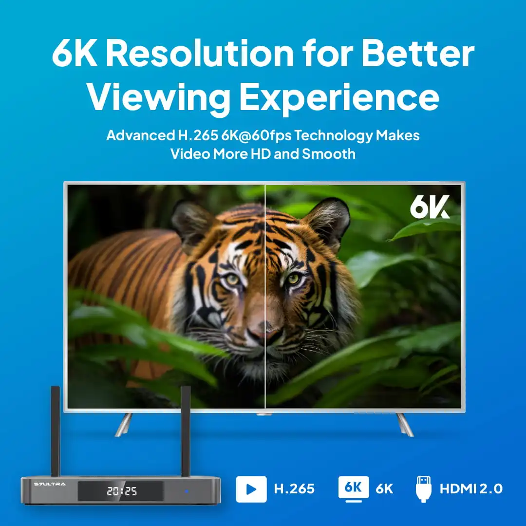 The SuperBox S7 Ultra supports up to 6K resolution for sharper details, richer colors, and smoother motion. With SDR, HDR, and AUTO display modes, it automatically adjusts to your TV and content for the best possible picture every time.