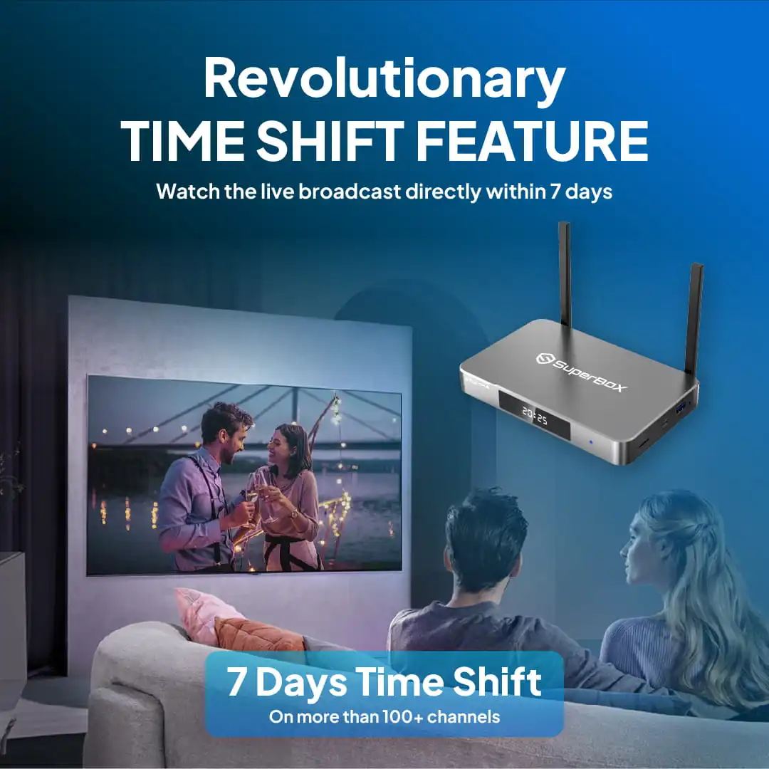 The SuperBox S7 Ultra sets a new standard in TV box performance with its upgraded 7-day Time-Shift feature. Compared to the previous S6 model, which supported rewind for up to 8 hours, the S7 Ultra lets you instantly access and replay programs from the past seven days. No downloads, no complicated setup — just effortless catch-up viewing anytime you want.